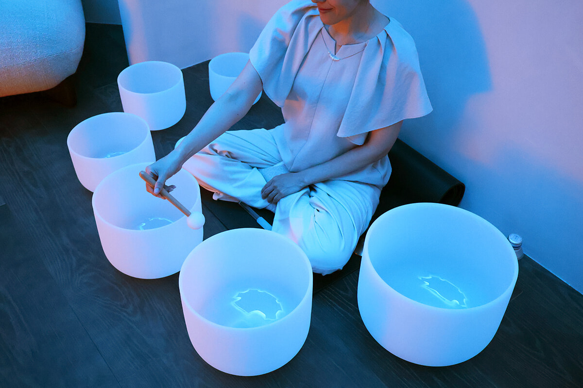 ルームキーを受け取ったあとは、もちろんエレベーターを使うことなく同じ階の自分の部屋へ。チェックインの際に、深いリラックスへ導くといわれるクリスタルボウルの音色で迎えてくれるが、なんと客室にも同じものが備えられている。優しく身体へ染みわたるように響く音をライフスタイルの一部に取り入れるという新鮮な体験も、自分の中の心地よさや、よりよい生き方を探るための大切な一歩に。