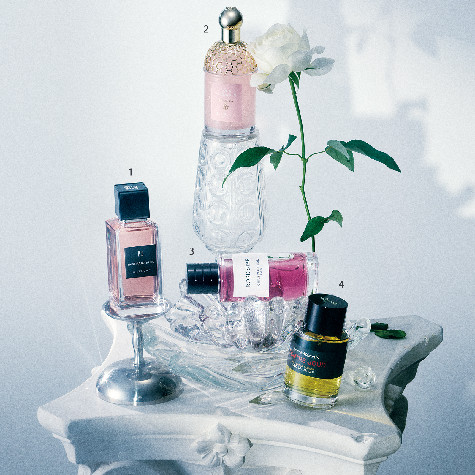 フローラルノートの中でもローズは特別な存在。最近は棘を思わせるスパイシーなアクセントに注目。気負わず、ひねりの利いたエレガンスを纏って。