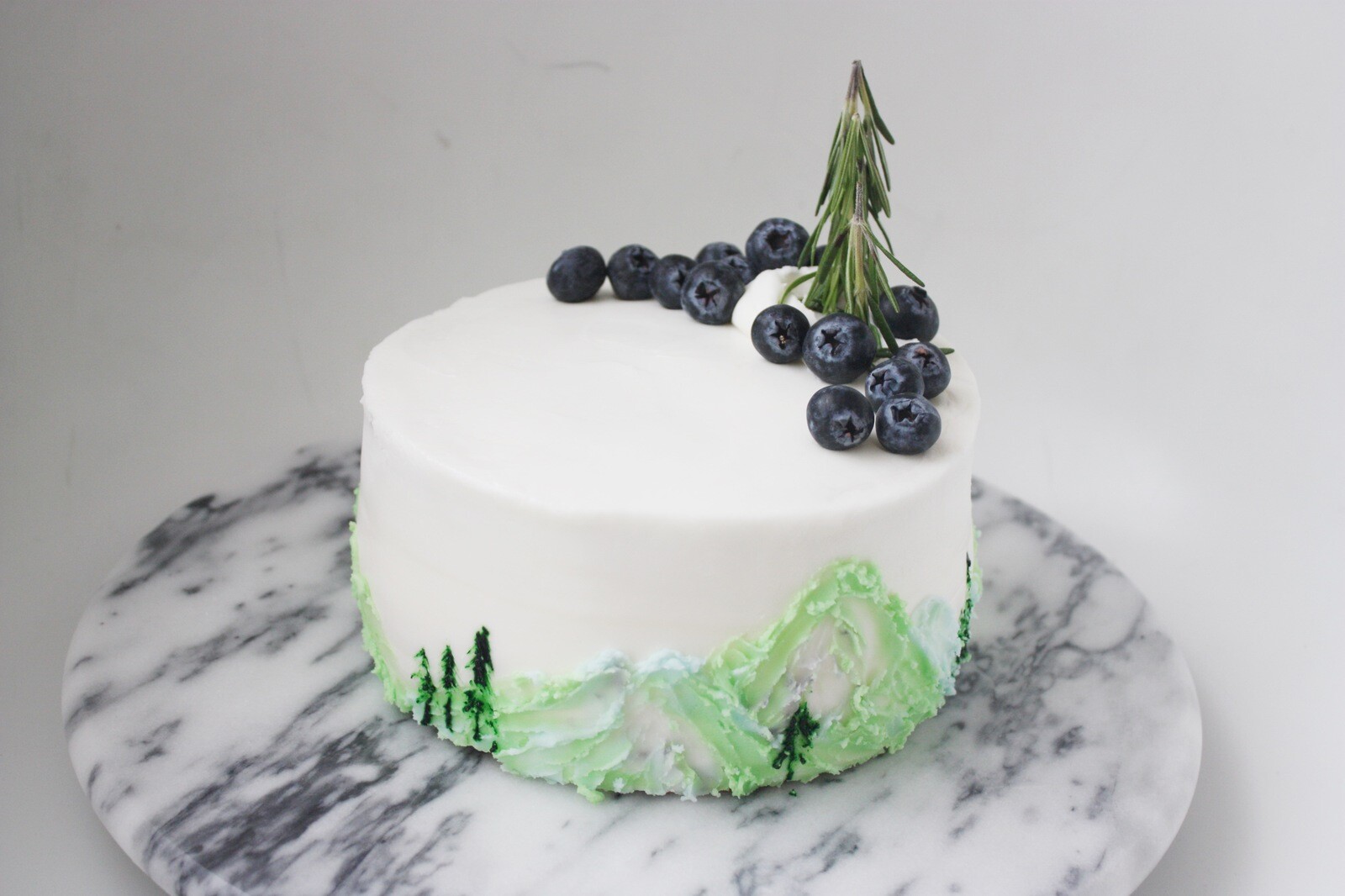 ケーキの側面に山々の絵柄を描いて、杉の木に見立てたローズマリーやブルーベリーを散らして仕上げました。360度パノラマの山景色を楽しめるケーキです。