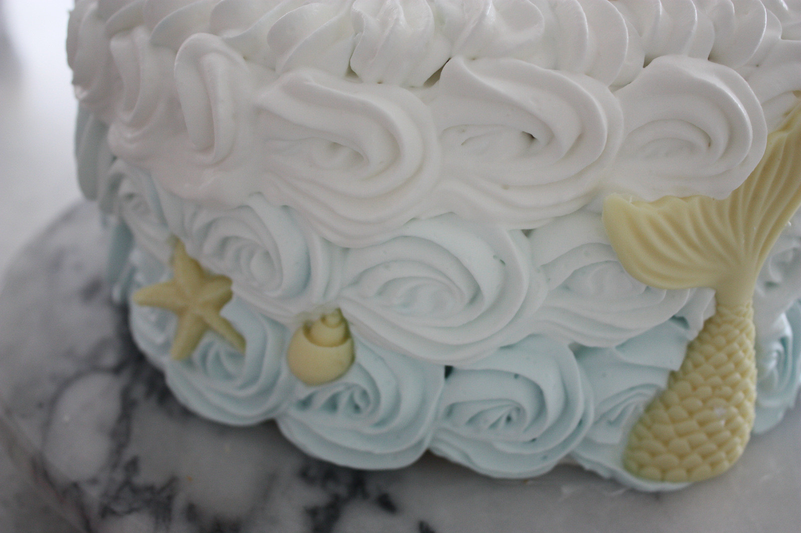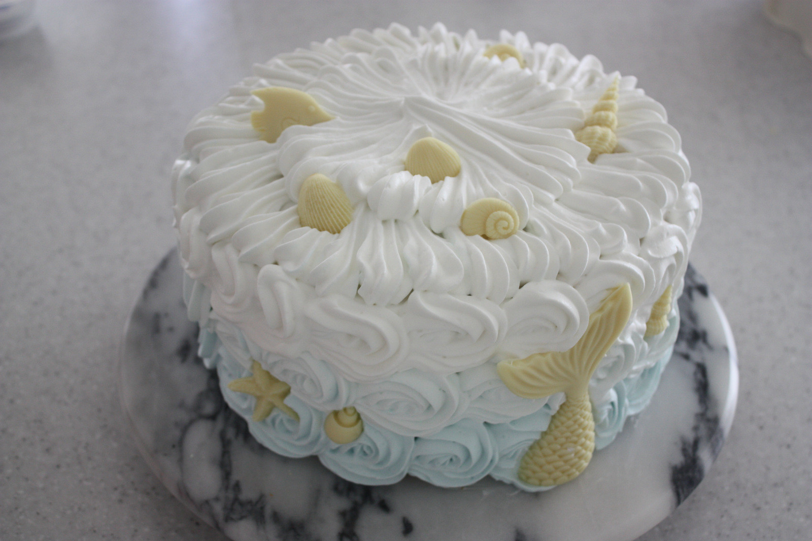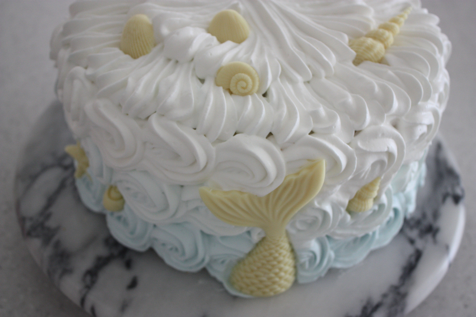 海からあがったばかりのようなケーキに、お好みでマーメイド小物をさらに乗せたら完成。ソイクリームを使ったヘルシーでシンプルな仕上がりのケーキです。