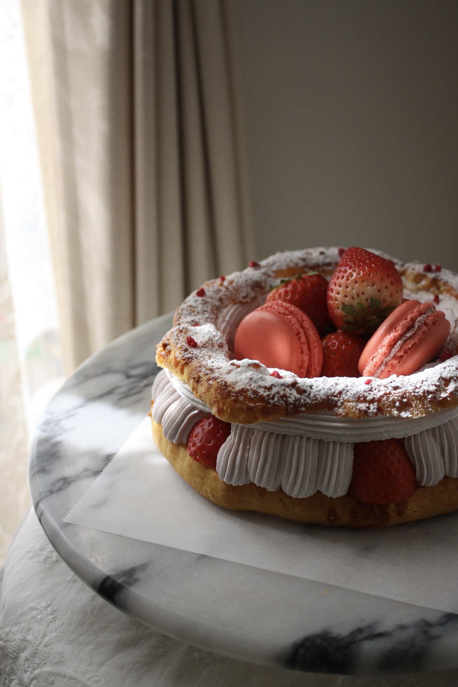 最後の最後に、丸ごといちごといちごのマカロンも詰めて!最高潮に至福な、「夢のパリ・ブレスト」の完成。