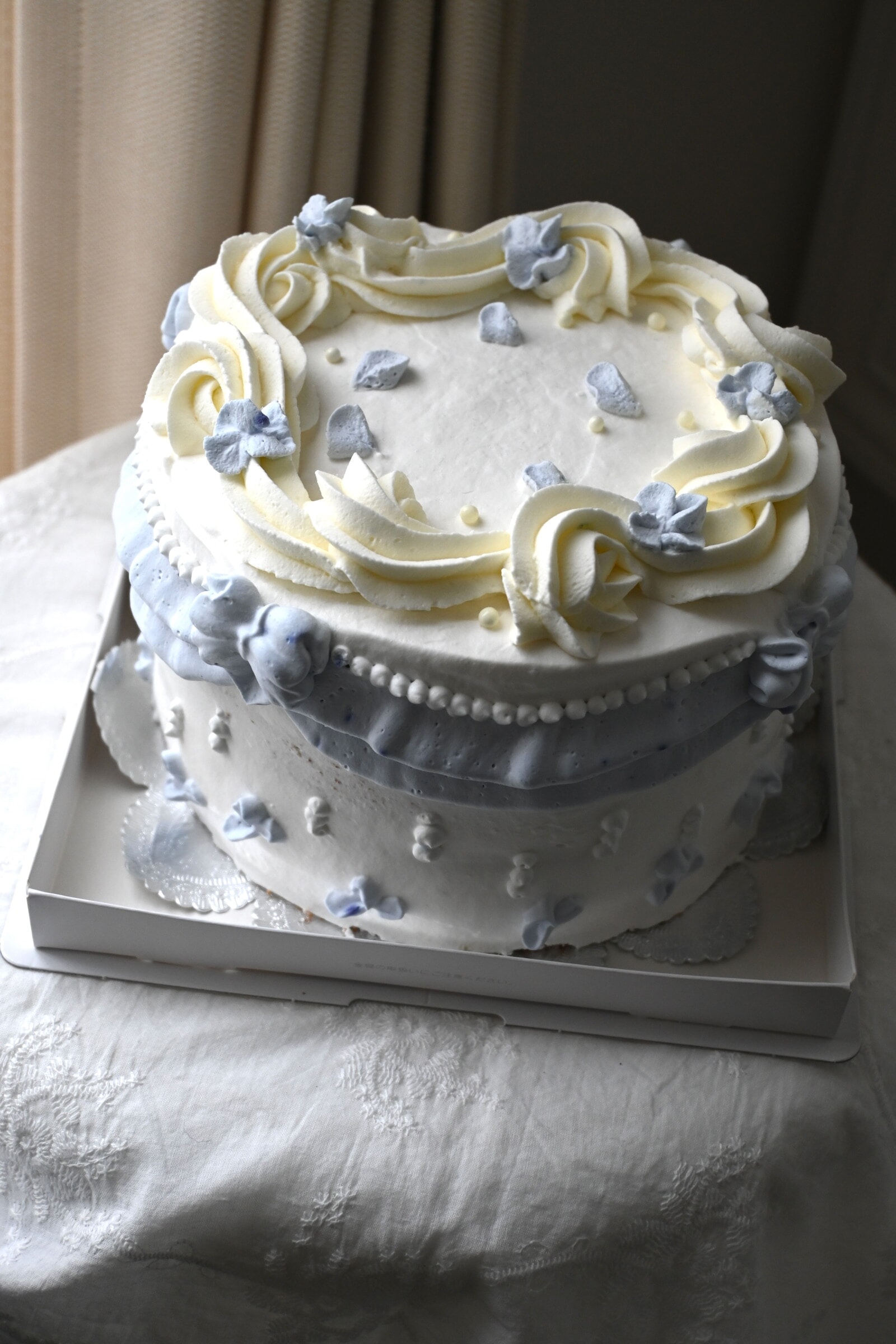 いつもより少しだけおしゃれして、フリルのパイピングや側面の模様、パールのようなドット絞り、ふんだんに絞ったクリームで贅沢にデコレーションです。