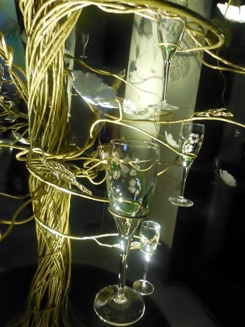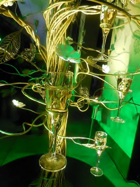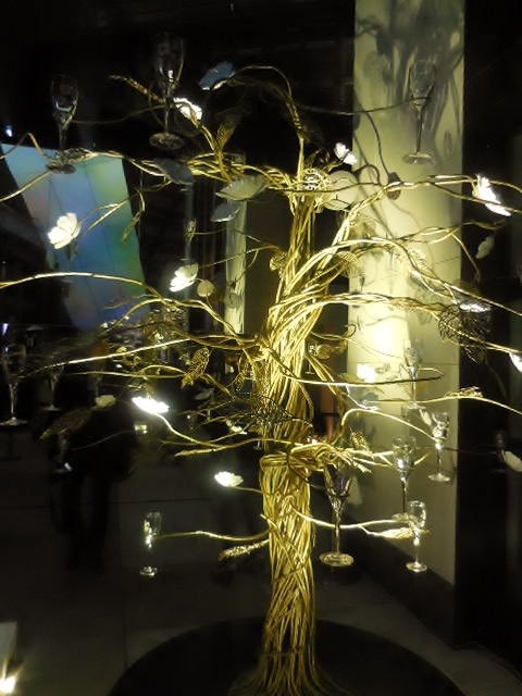 シャンパーニュが注がれ一層艶やかな雰囲気になったツリー。グラスに光が反射し、その姿は月明かりに照らし出された満開の桜の木のよう。