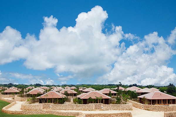 竹富の伝統建築を踏襲した「星のや竹富島」。一棟建て・平屋の客室はシーサーを配した琉球赤瓦の屋根、南向きの縁側など、風情あふれるスタイルでまとめられている。