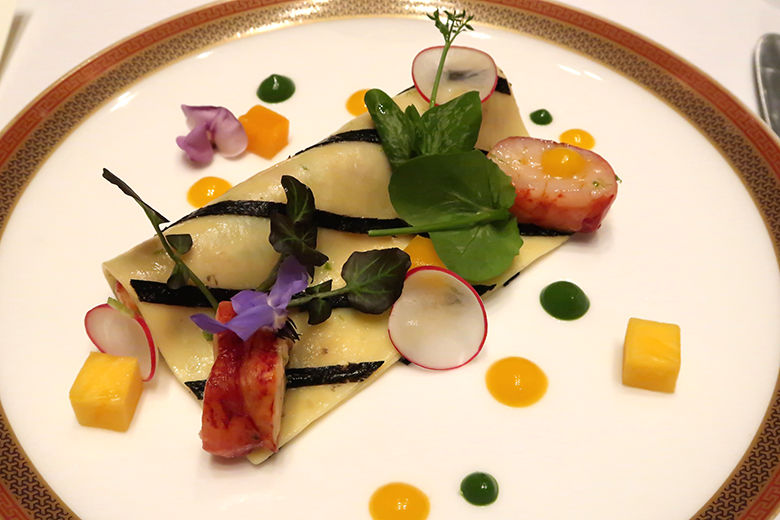 マンゴと生姜が味わいを添えるカネロニ&ブルーロブスター。ザ・ペニンシュラのキッチンには生簀が置かれ、うなぎやロブスターが最高のタイミングで調理される。