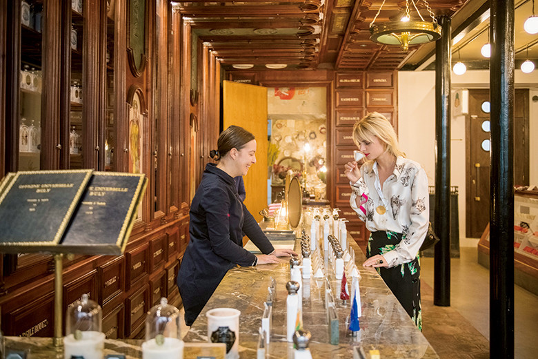 ビュリー2号店、オフィシーヌ・ユニヴェルセル・ビュリー・マレ&グラン・カフェ・トルトーニで、ウォーターパルファンの香りを試すアリス。