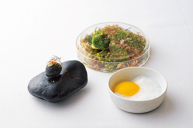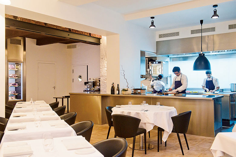 凱旋門とシャンゼリゼからほど近い16区の閑静な通りに、昨年7月オープン。オーナーシェフは、有名レストランのみならず鮮魚店、精肉店でも修業し、素材を見る目を磨いてきた手島竜司さんだ。特に肉には強いこだわりを持ち、修業時代もともにしたビジネスパートナーは、いまは精肉店主となり、彼の元から厳選の素材を仕入れている。中でも「1度に、品種の違う牛肉を食べ比べてほしい」と、備長炭で焼いた数種の盛り合わせをコースのメインとして出しており、評判だ。