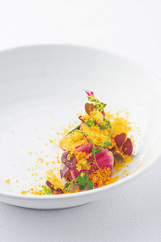 前菜のリムーザン産仔牛のタルタル。ふんだんにカラスミを散らしてある。カルダモンやコリアンダーの葉も味付けの要素のひとつ。
