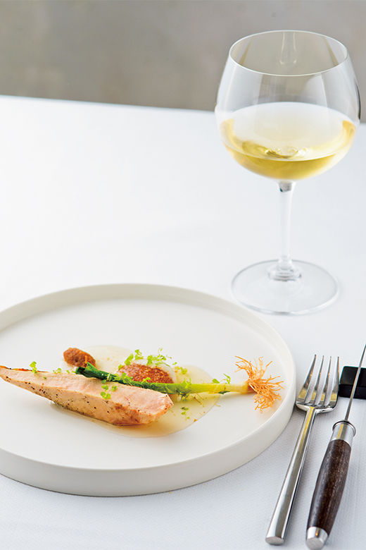 肉料理の1皿目、ランド産地鶏のロースト。揚げたポロネギ、セヴェンヌ産タマネギのピュレとコンポートを付け合わせに。ワインはブルゴーニュを中心150種を揃える。
