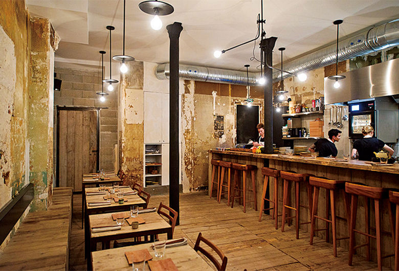 むき出しの壁や再利用の木材を配した床など、無骨でナチュラルな内装。