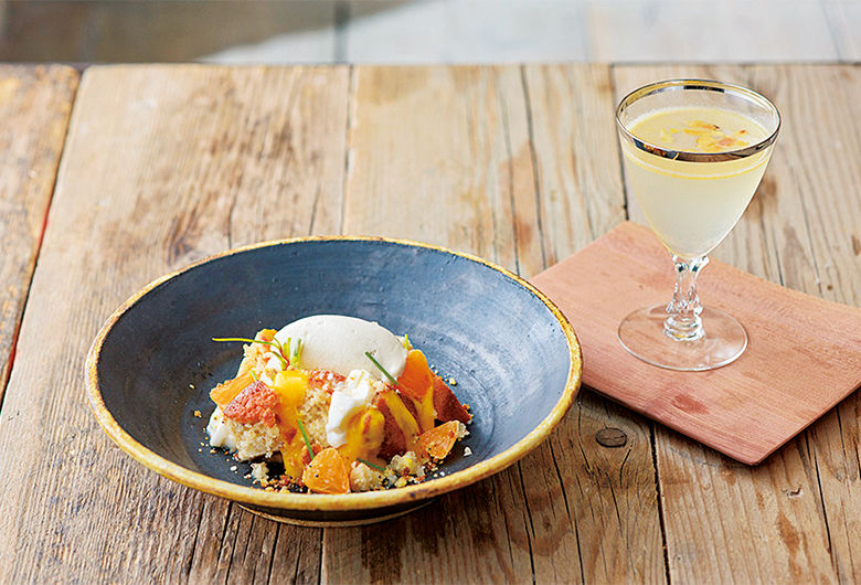アーモンドケーキにミカンのクリーム、菊イモのアイスをのせたデザート。カルヴァドスにカキのシロップを加えたフルーティーなカクテルと。