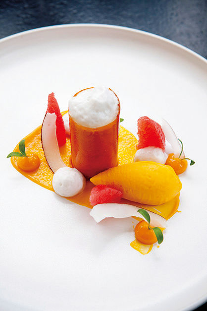 ココナッツのムースにマンゴー、グレープフルーツのクリームを添え軽い口溶けに。「CannelloniManguePomelos Rose Noixde Coco」13ユーロ