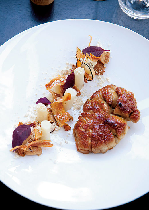 高貴な味わいがたまらない、森の香りの仔牛の胸腺肉。表面はカリッ、中はとろり。「Ris de VeauCroustiFondant, Salsifi s, Noisettes, Pied de Mouton, Tonka」37ユーロ