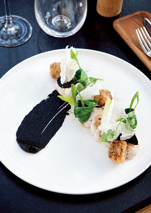 淡白だが旨味のあるエイの身と、さいの目状の揚げた豚足をイカスミとレモンのソースで。レモンの酸味とイカスミのコクが一体となった、うっとりするようなおいしさ。「Effilochéde Raie, Fritos de Pieds de Porc, Pak Choï, Ail Noir, Citron」14ユーロ