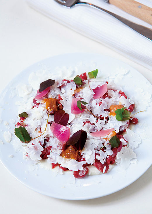 さっぱりした牛のタルタルに、濃厚なウニと薄くスライスしたカリフラワー。味のコントラストが楽しい。「Boeuf Cru Oursin Chou-Fleur 」14ユーロ