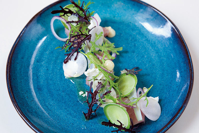 カツオの刺身に、羊乳のフェタチーズとアーティチョークを合わせて。意外なアソシエーションは、まさにおいしいサプライズ。「Bonite Feta Artichaut」10ユーロ