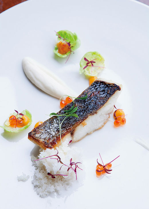 スズキの1種オオニベに、カリフラワーのピュレ、甘酸っぱいミカンを添えて。「MaigreRôti Mousselinede Chou-Fleur, Condiment Mandarine」24ユーロ