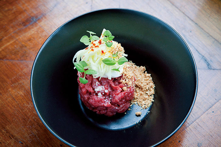 タルタルと青いマンゴー、トリュフのクリームを合わせた店の定番でもある前菜。淡白な味わいの牛の赤身と、マンゴーのシャキシャキ感が心地いい。ゴマ塩でシンプルに。「Tartare deBoeuf ManguesVerts, Crème à la Truff e 」12ユーロ