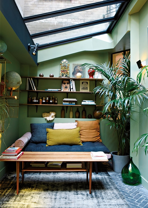 カフェの一角が天窓になっていて、自然光が降り注ぐソファは特等席。コーヒー3ユーロなど。