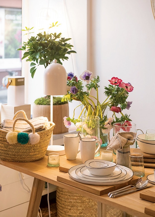 スカンジナビアのモダンな食器に、モロッコカゴを合わせたオフホワイトとベージュの柔らかなテーブルには、季節の花で彩りを添えている。プレート20ユーロ〜