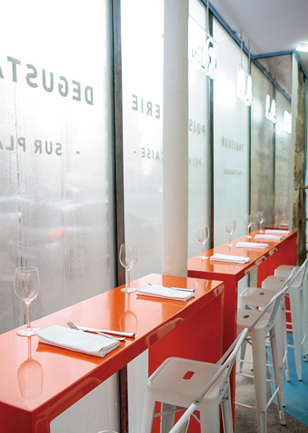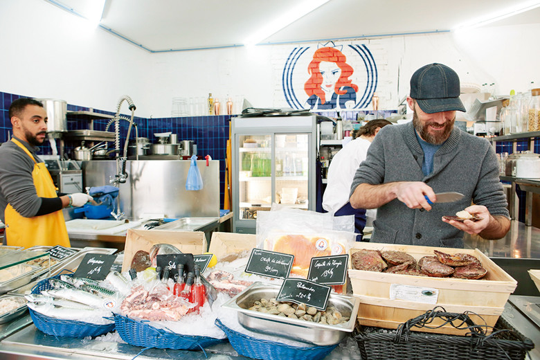 サステイナブルな漁業で収穫されたフランス産の鮮魚を扱う店がイートインスペースを併設。新鮮なカキや貝類を 生で味わえるのはもちろん、ハーブや柑橘フルーツで味付けしたスズキやタラのカルパッチョ、オリエンタル風味のタコ、ミントで味付けしたホタテなど、本格的な料理を日替わりで供する。潮の香りに囲まれた市場気分を楽しんで。