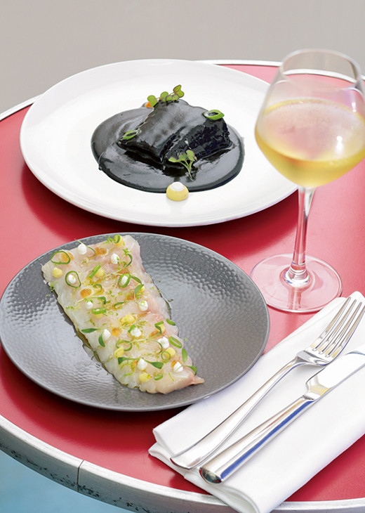 手前から、スズキの刺身「Sashimi de Bar de Ligne」17ユーロ。タラの料理「Lieu Jaune」は45ユーロのコースより。ワインは5.50ユーロ〜