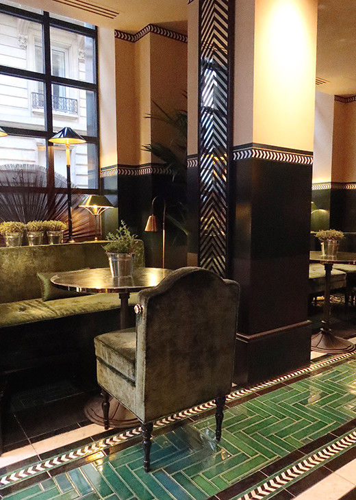 床のグリーンのタイル、グリーンの天鵞絨の椅子……ソー・ブリティッシュ!! なロビー。