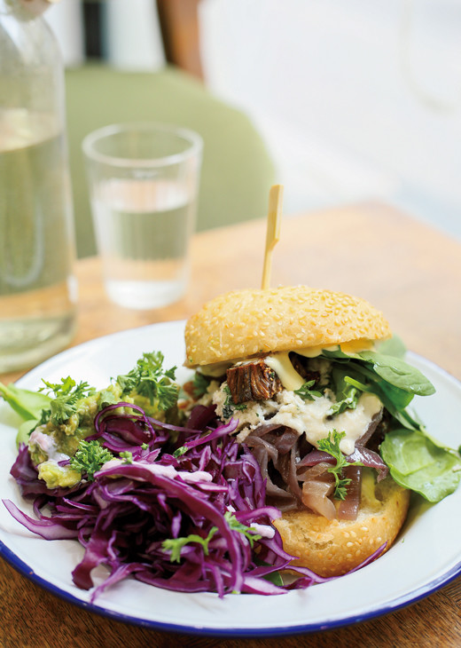 大豆やエンドウ豆を主原料としたヴィーガン ミートにブルーチーズ風ソース、イチジクと水菜のサラダのバーガー「Portobello Toast」10ユーロ