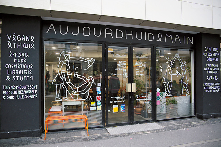 食品からコスメ、服、靴まで、ヴィーガン製品が揃う、パリ初のコンセプトストア。窮屈だと思われているヴィーガンのイメージを変えたいという思いから始めたそう。併設のカフェでは、グラノーラやクレープ、アボカドトースト、ランチ時はバーガーやソバ粉のガレット、サラダなどを用意。料理に使っているヴィーガン向けのチーズやフォアグラは、店内で購入することも可能。
