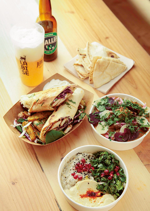 上から時計回りに、シリア料理ヒヨコ豆のペースト「Houmous, Crème de Pois Chiches」、ナスのペースト「Houmous, Caviar d’Aubergine」各6ユーロ、ジョージア料理チキンと野菜のピタ巻き「Mtcvadi」、インド料理レンズ豆カレー「Daal Nakahani」各11.50ユーロ