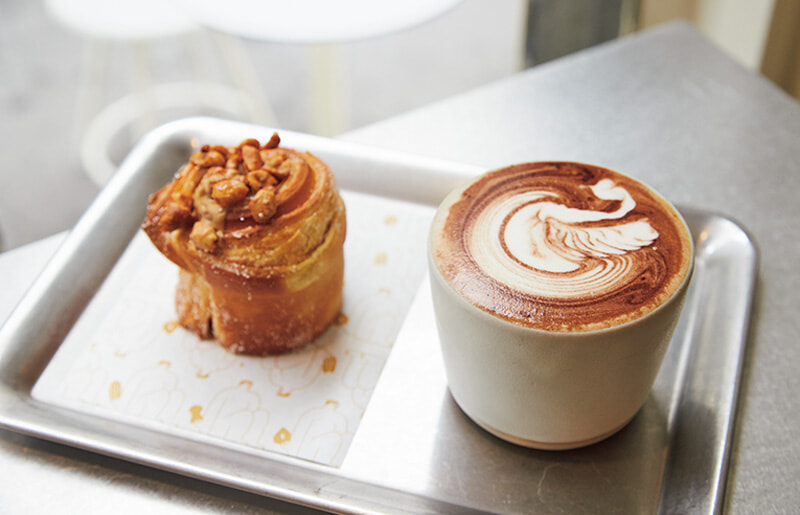 右から、コーヒーをベースに、エスプレッソとピーナッツバター、オーツミルク、ローカカオを入れた「Le Buddy」5.50ユーロ、菓子はクロワッサン生地にピーナッツクリームを詰めた「Cream Cruffin」5.50ユーロ