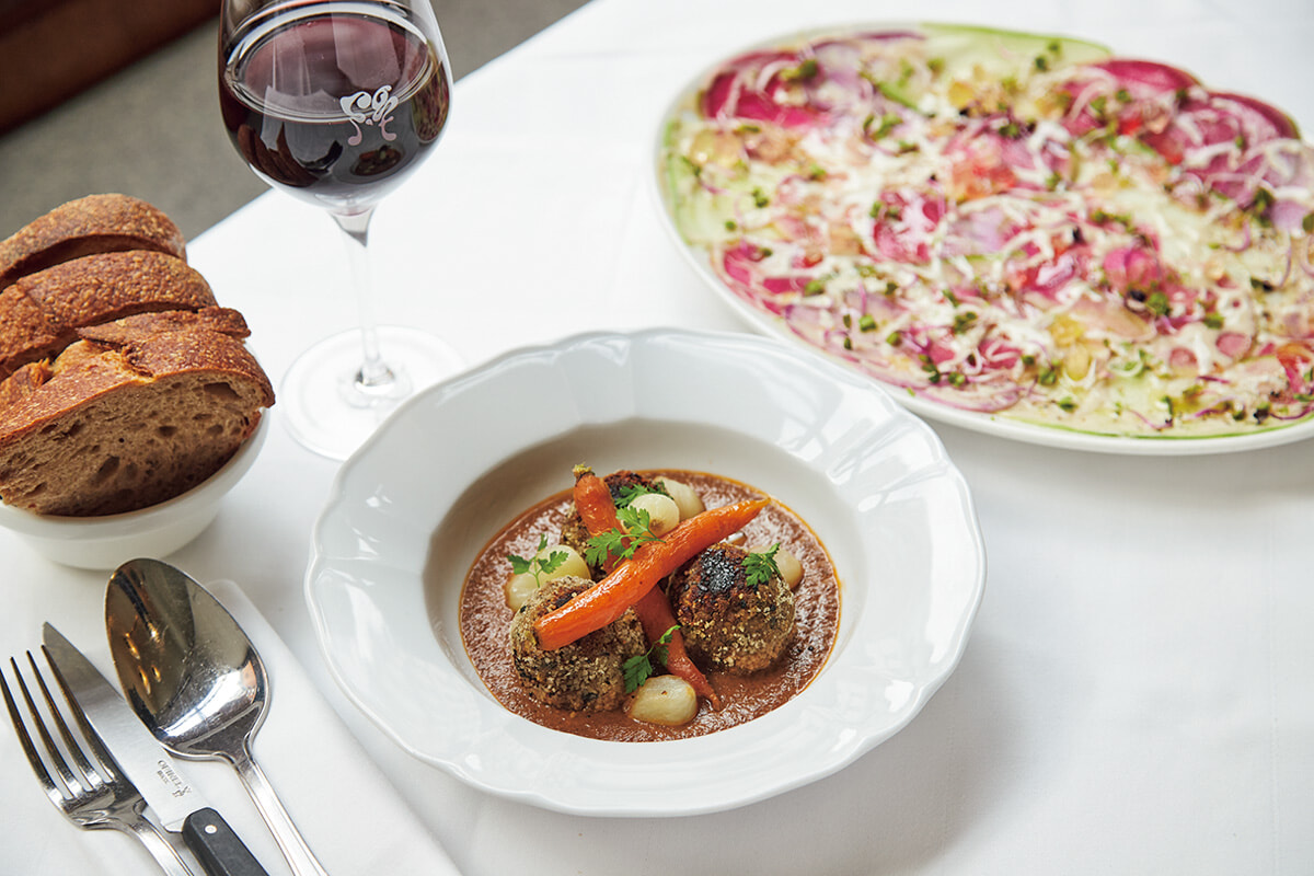 プラントベースの料理や菓子を提案する店が増える中、同店は伝統的なフレンチに欠かせないソースを重視。野菜やキノコ、海藻を煮詰めた濃厚で艶やかなソースが深みと奥行きを与えている。看板料理はブロッコリーのワカモレ、キノコと燻製大豆で作るクロケット、キノコやパンをキャベツに詰めて野菜ソースを添えたシューファルシなど。前菜、メインの区別がなく、自由に選びシェアできるのも魅力。