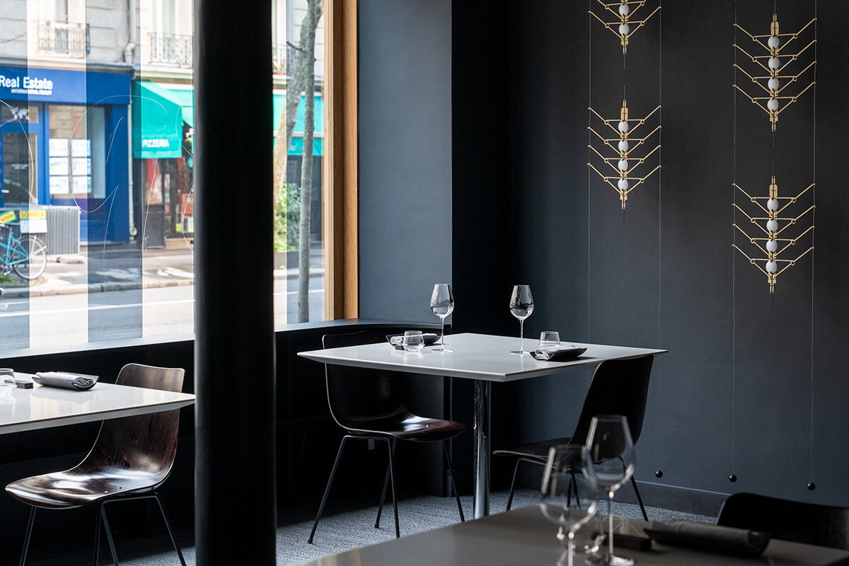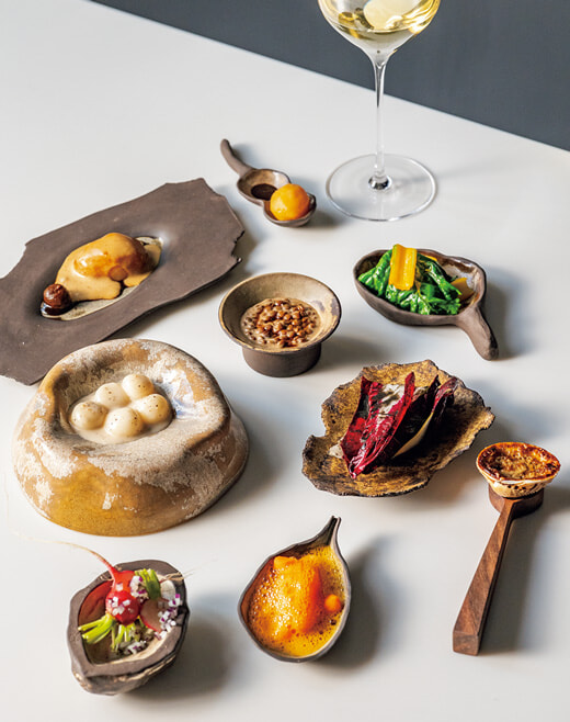 料理はランチコース60ユーロより。突き出しの小皿料理「Peties Assiettes」が目を楽しませてくれる。カフェ風味のキクイモ、サツマイモとカラスミ、黒ゴマ風味のトレヴィスサラダ、アサリの味噌和え、レンズ豆サラダなど。ディナーでも提供する。グラスワイン 12ユーロ~