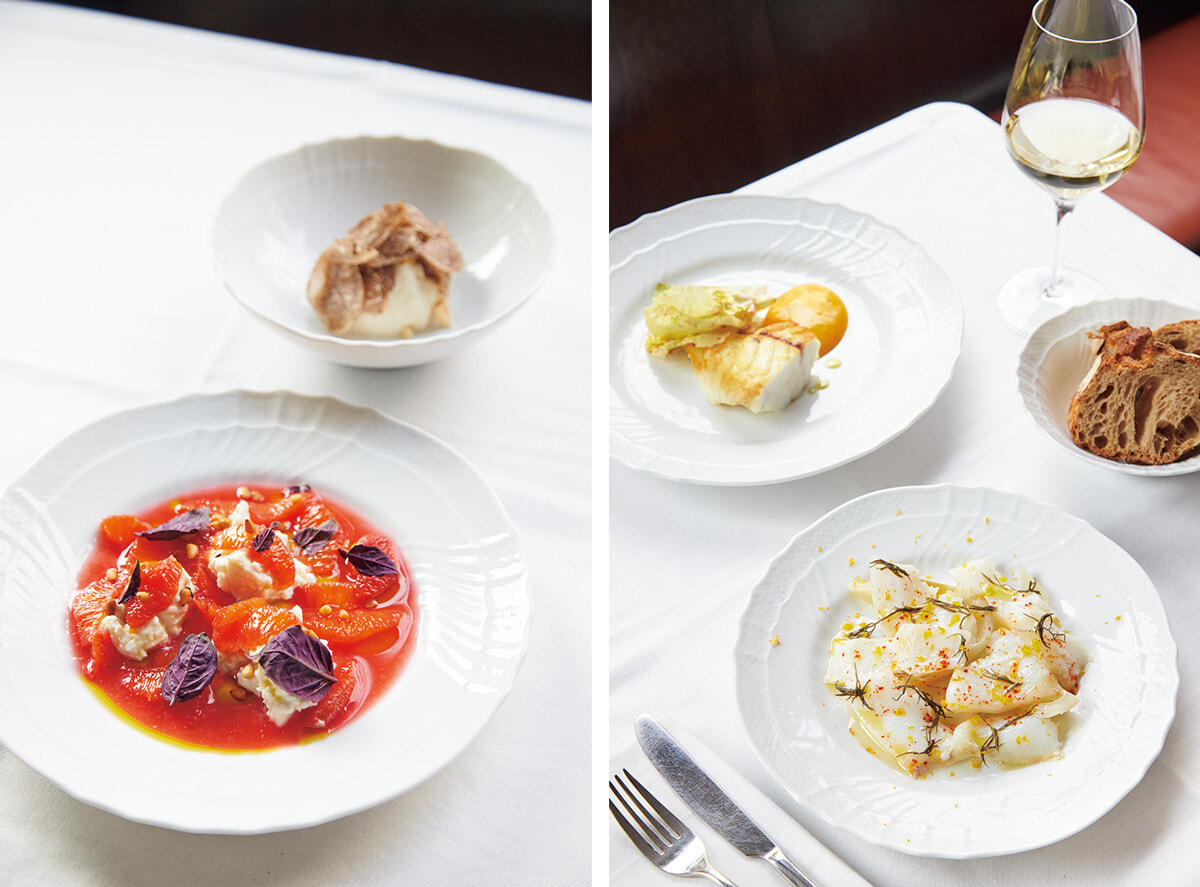 左: デザートは手前から、ブラッドオレンジとコルシカ産チーズ、ブロッチュの一品「Oranges Sanguines, Brocciu」15ユーロ、白トリュフとヘーゼルナッツのクリーム「Pâte de Noisette, Crème Fouettée aux Noisettes, Truffe」12ユーロ~ 右: 手前から、塩ダラとフェンネルの前菜「Morue Effeuillée, Fenouil Confit」28ユーロ、アンコウとカステルフランコのアイオリソース添え「Lotte Petit Bateau, Castelfranco, Aïoli」45ユーロ、ワインはグラス10ユーロ~