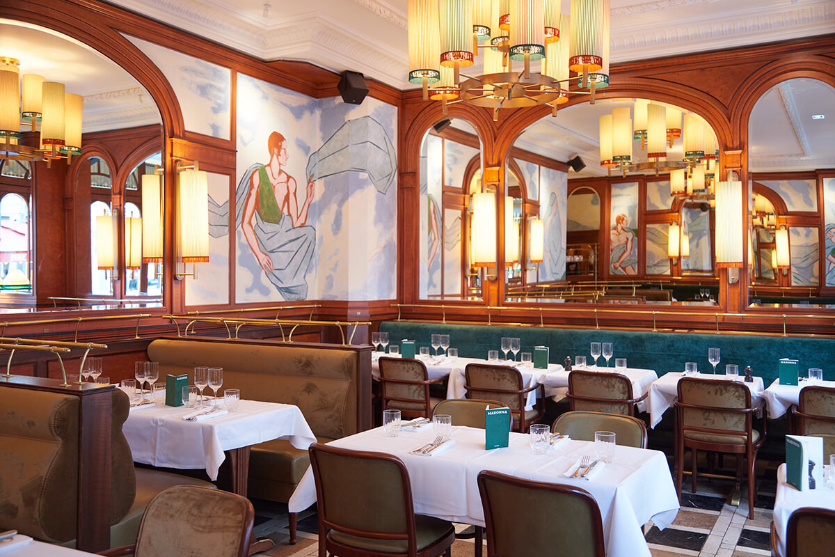 シックでありながら陽気なイタリアの雰囲気を味わえる店。パリのブラッスリーならではの木の壁や真鍮の装飾に、現代イタリア人画家によるフレスコ画、レトロな照明や椅子を融合。料理はイタリアの伝統を尊重したボンゴレや仔牛のミラノ風カツレツなど。「目の前で仕上げてくれるティラミスまで、美味かつきれい!」と作家・フードコンサルタントの推薦人、エロイーズは絶賛。