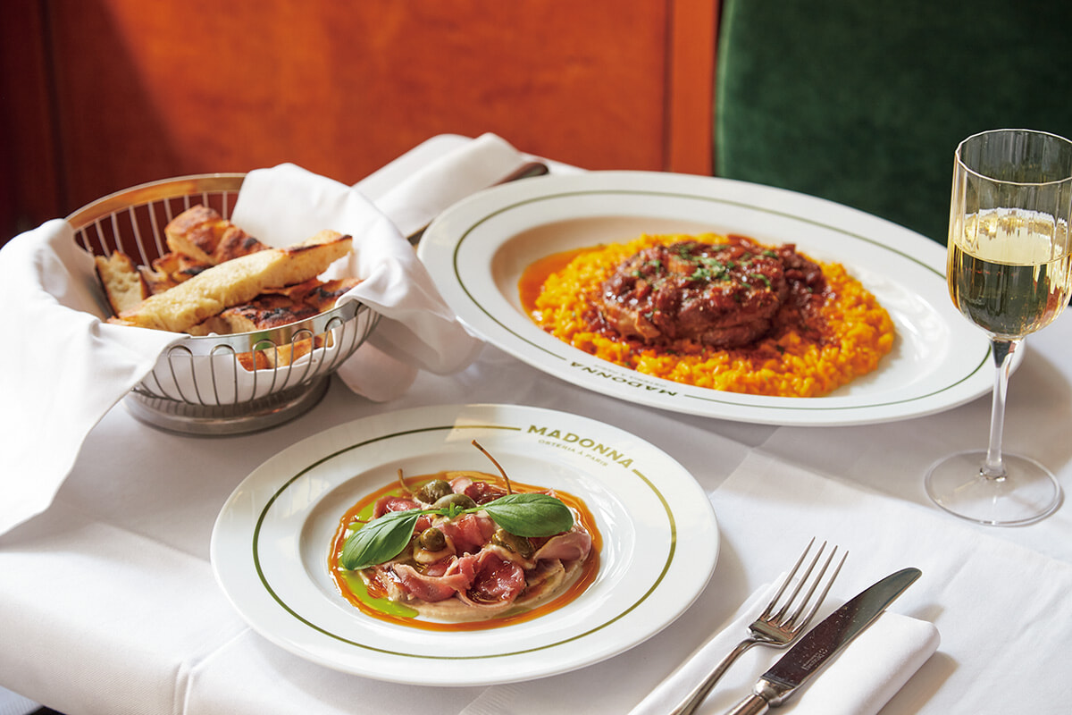 手前から、仔牛肉のツナソース「Vitello Tonnato con Tonno Rosso」15ユーロ、フォカッチャ「Focaccia Genovese」6ユーロ、仔牛スネ肉の煮込み「Ossobuco alla Milanese」29ユーロ、グラスワイン 6ユーロ~