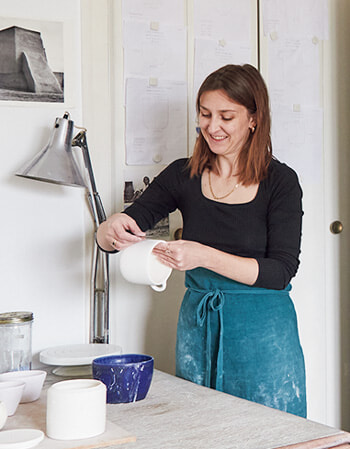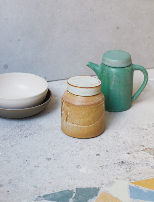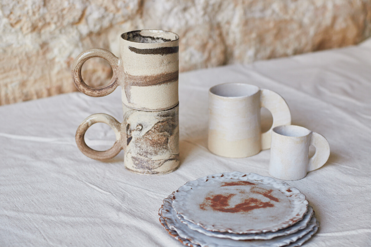 大学で建築を学ぶ中で陶芸に興味を持つようになったというシラーヌは、ギリシャのコルフ島やコペンハーゲンのアトリエで修業を積んだ。古代ギリシャの石器に見られるナチュラルな色調や質感、北欧のクリーンでモダンなスタイルを融合し、ミニマルで洗練されたストーンウェアを展開する。光沢のある透明釉薬を用いたクラシックなフォルムに、マグカップの小さなハンドルなど、ひとクセあるデザインが新鮮な印象だ。