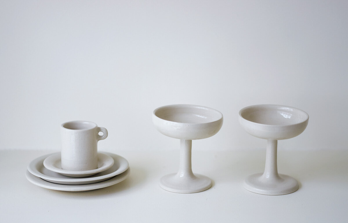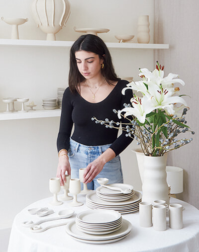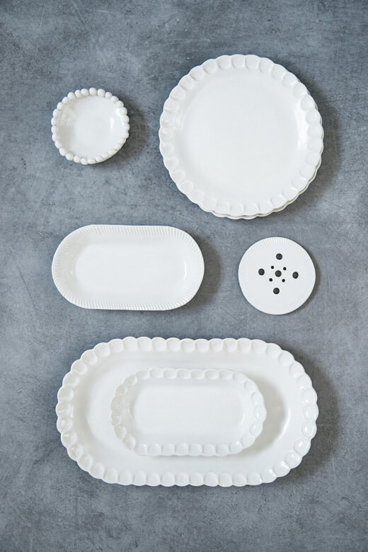 グラフィックデザイナーだったマルスカ・パチョラズが、陶芸家に転向したのは2年前のこと。パリ郊外の自然豊かな環境で、植物からインスピレーションを受けて作陶している。なめらかな質感としなやかなフォルムのストーンウェアにモデリングの技術を駆使し、彫刻的なエッセンスをプラス。雫を彷彿とさせる粒の縁取りや型押しすることで花びらのようなフォルムに仕上げたプレートなど、甘く可憐な世界観は人気の予感。