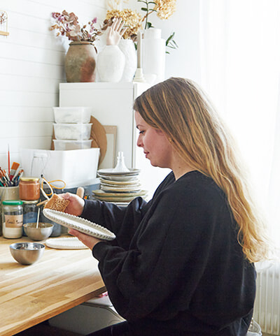 学生時代にアートの歴史を勉強し、フランス人彫刻家ヴァランティーヌ・シュレーゲルにインスパイアされ続けてきたというエルザ・ハアス。しなやかでナチュラルな曲線を描いたうつわが、それを物語っている。なめらかな質感にこだわり、ユニークなテクスチャーを見つけては再現できないか実験。釉薬の研究にも注力し、白い釉薬に青い色素をちりばめたスタイルが印象的だ。品の良い佇まいで、どんな料理も軽やかに包み込む。