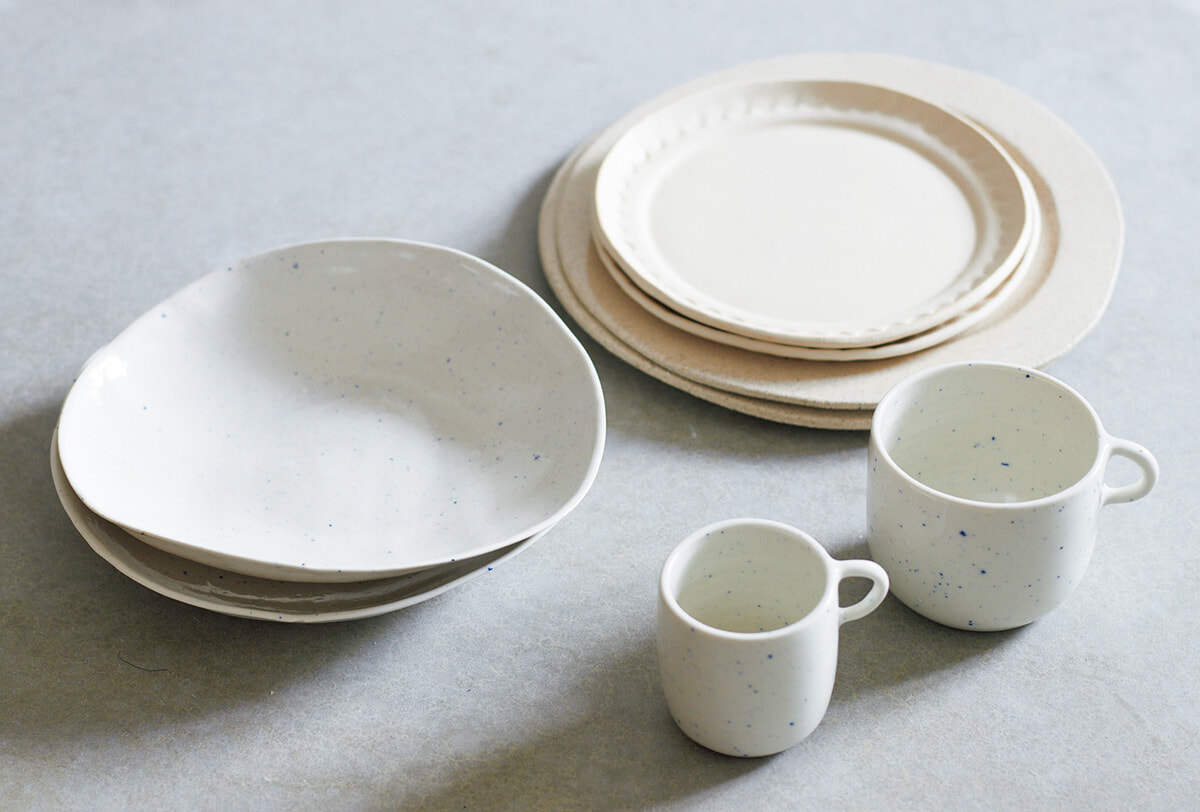 左奥のマーブル模様のマグカップ各38ユーロ。左の2色の白で構成したマグカップ大38ユーロ、小32ユーロ。左下は、ラフに仕上げた縁が印象的なプレート小各35ユーロ、大各38ユーロ