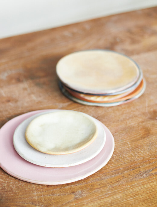 インテリアスタイリストを経て陶芸の道に進んだマリオン・グローは、数々のレストランからオーダーを受ける人気作家。優しく淡い色合いのニュアンスカラーと、ナチュラルな曲線を描いた薄いプレートが持ち味だ。釉薬を重ねて使うことによって、ピンクやブルー、グレイッシュなど、同じ色でも絶妙に異なる色彩に仕上げている。豊富なバリエーションから色違いやサイズ違いで揃えて、テーブルスタイリングを楽しみたい。