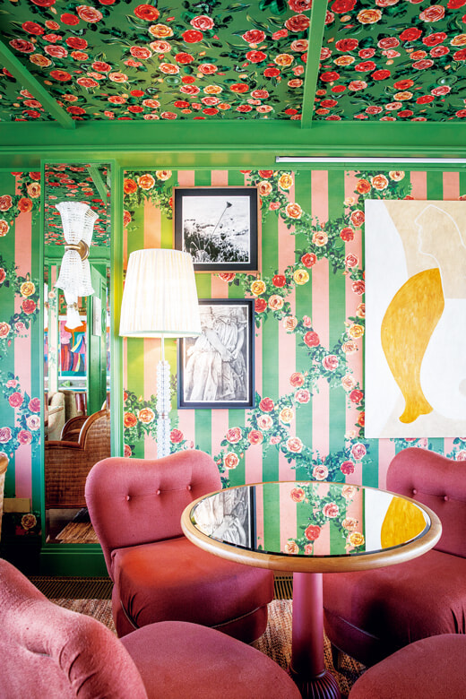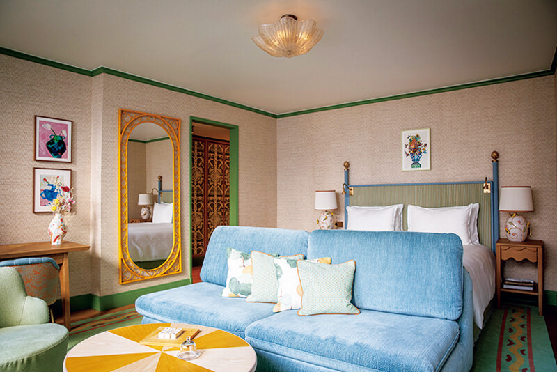 植物モチーフの壁紙、鳥やカエルのレリーフが愛らしいベッドサイドのランプ……ホテルのためのオリジナルもあれば、彼がアーティストにオーダーした植物をテーマにした装飾のあれこれ。目に優しい色彩でまとめられた室内には長閑さが漂う。その一方、レストラン、ルーフトップバーは、自然がカラフルに表現されて華やかで陽気な雰囲気だ。地下のホリデルミーのスパも含めて都会の贅沢を楽しめる、ここは楽園!