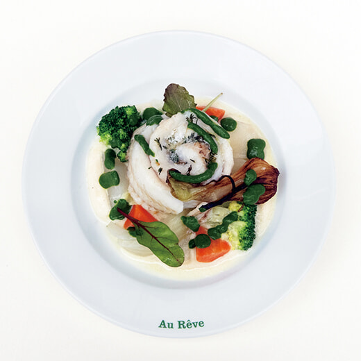日替わりランチは2皿17ユーロ、3皿21ユーロ。この日の日替わりランチのメインは、白身魚のオーブン焼きに季節の野菜を添えた「Filet de Merlan au Four, Légume de Saison」