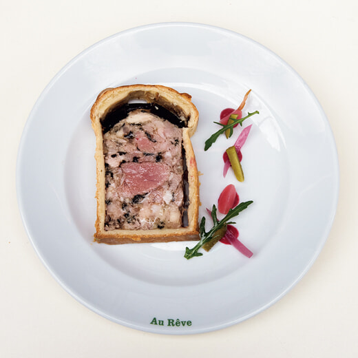 どの料理も自家製だが、オ・レーヴご自慢の一品はパテのパイ包み。「Pâté en Croute de Houdan」14ユーロ
