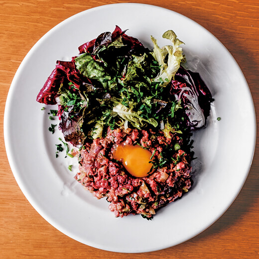 定番のタルタル。単純な料理に見えるが、挽肉か、包丁で細かく切るか、調味してサーヴするか店によってさまざま。「Tartare de Boeuf Français」19ユーロ