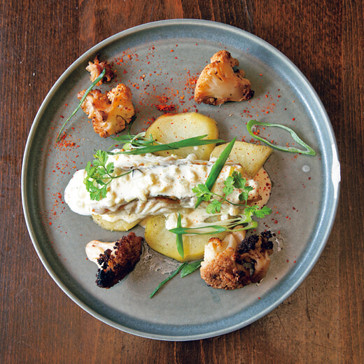 ランチは2皿18.50ユーロ、 3皿22.50ユーロ。この日の魚料理は、シロイトダラ。ジャガイモと味噌風味のカリフラワーが付け合わせに。「Lieu Noir, Pommes de Terre Fondantes, Choux Fleurs rôtis au Miso,Crème de Moules」16.50 ユーロ