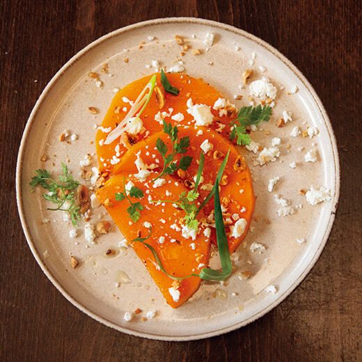 ランチの前菜はスパイスが香るバターナッツのロースト。フェタチーズの塩味がアクセントに。「Butternut Rôti au Miel, Raz et Hanout Fêta Noisette」7.90ユーロ