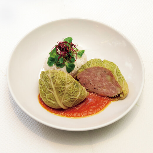 人気メニューは牛肉のワイン煮込みと、写真のロールキャベツ「Chou Farci du Bougainville, Riz Basmati」18.90ユーロ