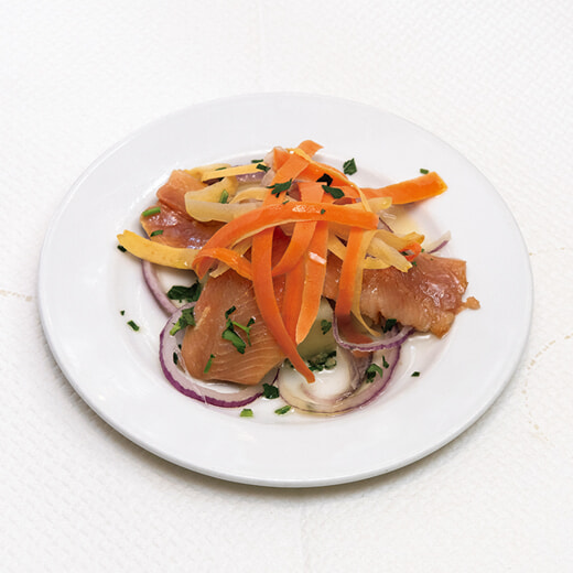 ビストロ定番前菜の酢漬けニシンとジャガイモの盛り合わせも、ニンジンを添えて彩りを。「Filets de Harengs, Pommes Tièdes à l’Huile」8.50ユーロ。日替わりランチは2皿23.50ユーロ、3皿28.50ユーロ