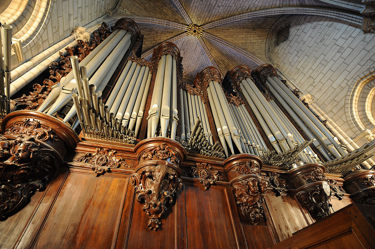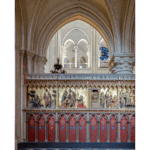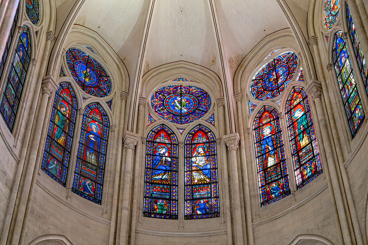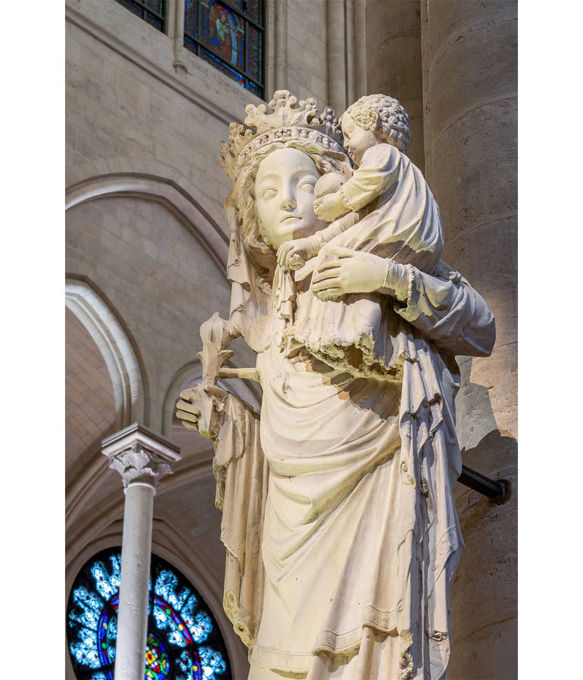 大聖堂に足を踏み入れれば、長年の埃が払われ磨き上げられた白い石壁にステンドグラスが色を映す大空間に圧倒される。入口からまっすぐに祭壇の方向を望めば、天井高33メートルのアーチの連なりの奥に、金色に輝く十字架とステンドグラスが見える。ネフ(主廊)を囲む側廊に沿って並ぶチャペルの色鮮やかさ。祭壇の後ろにあるクワイア(聖職者のためのスペース)を囲む内陣障壁には14世紀の彩色彫刻が生き生きと蘇り、キリストの生涯と復活後の物語を伝えている。北、南、西側を彩るバラ窓。西のバラ窓をバックにシルバーに輝くパイプオルガン。十字架のキリストが頭に頂いていたいばらの冠の一部とされる聖遺物も火災から無事に救出され、東側の奥の「聖母マリア7つの悲しみ」チャペルの中央に安置されている。